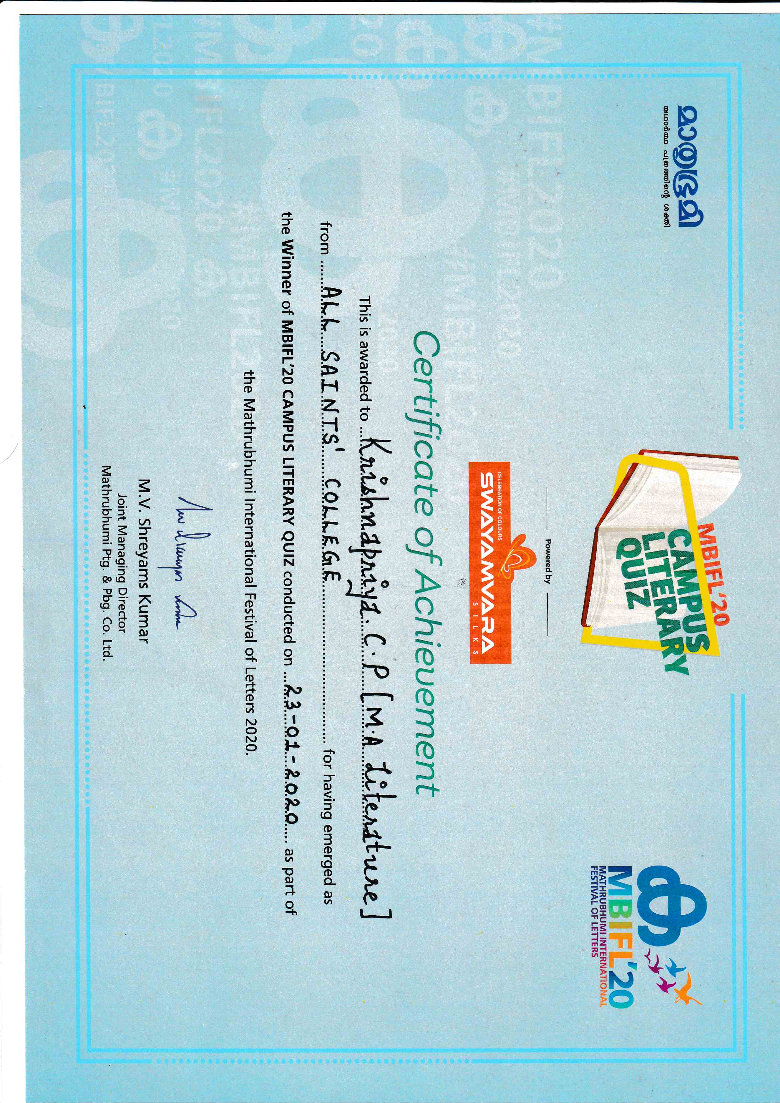 | 24 | Krishna Priya Campus literacy Quiz | |